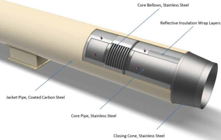 내부에 expansion joint가 없는 경우에는 jacket pipe에 bellows를 설치하여 열로 인한 움직임을 흡수할 수 있다. 그럼에도 conventional insulated piping에서 요구한 120m가 아닌 360m마다 expansion loop를 설치한다.