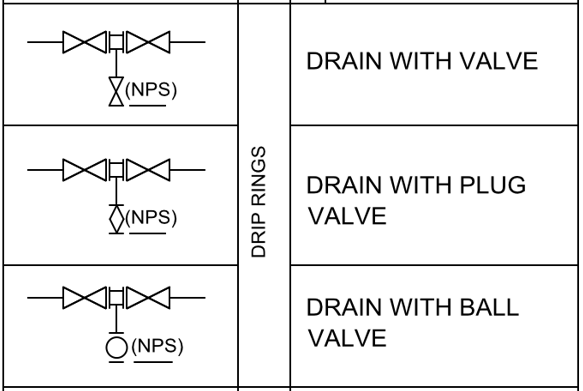 Drip ring은 2개의 flange사이에 설치되어 drain, vent, sampling이나 계기 (온도, 압력, 유량 등) 부착 혹은 flushing용도를 위해 safe access를 고려한 piping specialty이다. Drip ring 자체는 내부가 비어 있는 상태이고 side에는 하나 이상의 원형 hole이 있어서 밸브나 plug로 연결되어 유체나 압력 배출용으로 사용될 수 있다. 원형 hole은 threaded 혹은 socket-welded connector로서 drain, vent용을 위한 별도의 밸브 설치를 위한 공간이 충분치 않거나 dead zone을 최소화하기 위해 고려할 수 있다.