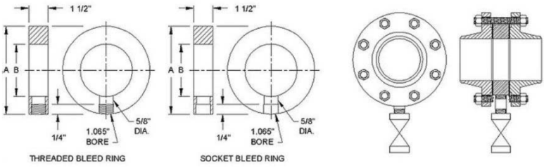 어떤 경우에는 굳이 drip ring과 bleed ring을 구분하여 적용하기도 한다. 이 때, Drip ring은 valve나 pump와 같은 device로부터 leak를 포착하거나 모으도록 고려된 fitting으로서 주로 설비의 아래에 설치되어 주변 환경으로 leak가 되지 않도록 한다. Drip ring에 대한 표준 size는 1”~24”이며 rating은 150#~1500#이다. 반면 bleed ring은 배관상 2개의 flange사이에 설치되며 배관이나 시스템으로부터 압력이나 유체를 배출하기 위한 fitting이다.