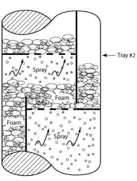 그러나 실제로는 D/C나 tray 혹은 outlet weir에 clear liquid는 없으며 이들은 거품 형태로 존재하는 aerated liquid이다. 이들 aeration 효과를 보상하는 factor는 0.5이며 따라서 대부분 HC service에서 50%를 사용한다. 만약 D/C내 clear liquid 높이가 12"로 계산된다면 실제 foam이 있는 액체 높이는 24"가 될 것이다. 그래서 weir높이와 함께 D/C내 실제높이가 24"라면 D/C foam이 범람하여 윗단 tray를 flooding하게 된다.