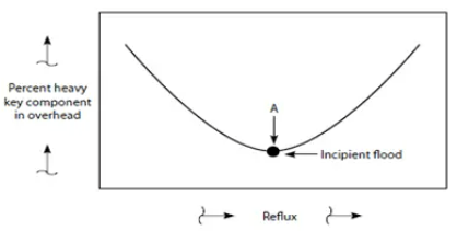 아래 가장 낮은 point A가 incipient flood point라고 하여 이점 전후 즉, reflux rate가 증가하든 감소하든 overhead에서 heavy key component가 증가하기 시작하여 결국 분리효율의 감소를 의미한다. 그래서 이 점을 최적의 reflux rate라고 한다.