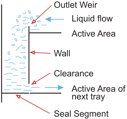 D/C seal에 대한 적절성을 확신하기 위해 D/C bottom edge는 outlet weir의 top edge보다 0.5" 작아야 하며, V/P나 실제 내부 inspection을 통해 확인해야 한다. 만약, outer weir의 높이가 downcomer의 아래쪽 끝 단보다 낮다면, 아래에서 올라오는 vapor가 downcomer쪽으로 흐를 수 있고 이는 내려오는 liquid를 밀어올려 Flooding을 야기할 수 있다