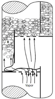반면 jet flooding은 entrainment flooding이라고도 하며 이는 vapor capacity와 관련이 된다. 즉, 아랫단에서 올라오는 vapor유량이 증가하면 다량의 액적이 윗단으로 entrain되어 분리효율을 감소시키고 (액체가 현재의 stage에서 물질전달이후 아래단으로 가야하는데 윗단으로 올라가게 되어 단효과가 감소됨) 윗단에서 액체가 누적됨에 따라 flooding이 발생하여 마치 2개의 단이 하나의 단처럼 bridging현상이 일어난다.