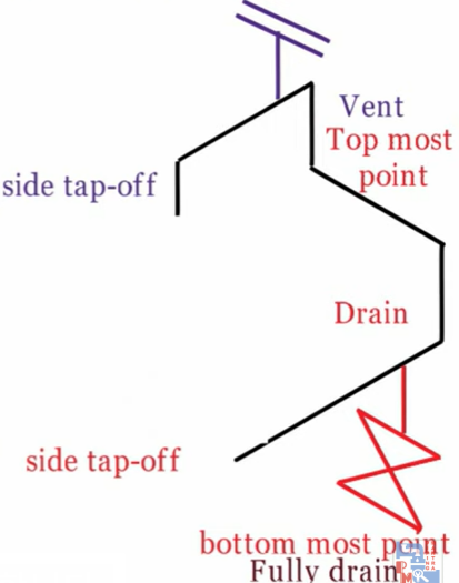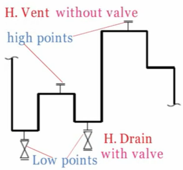 - Hydrostatic vent는 보통 main piping이 1 1/2”이상에 적용하고 1” 미만일 경우 self venting으로 간주하여 별도의 vent는 고려하지 않는다. 다만, drain은 main piping size와 무관하게 모든 배관에 설치한다.