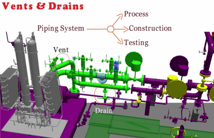 Vent와 drain은 공정상 혹은 시공측면, 테스트 및 commissioning 목적에 부합하도록 요구될 수 있다.