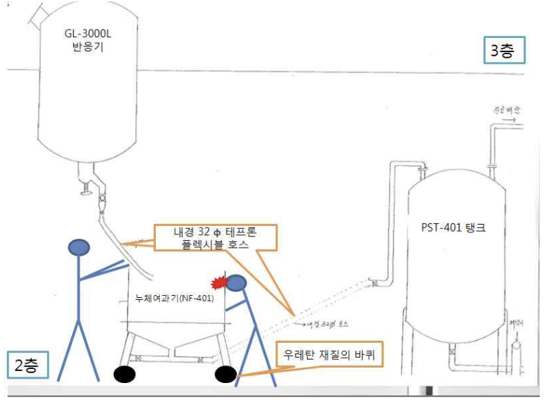 - 생산팀 직원 1명은 플렉시블 호스를 손으로 잡고, 호스 끝에 설치된 볼밸브를 이용하여 누체여과기로 이송되는 유체의 속도를 조절하고 있었고, 연구원 1명은 이상유무를 확인하기 위해 옆에서 작업 진행과정을 지켜 보았음.