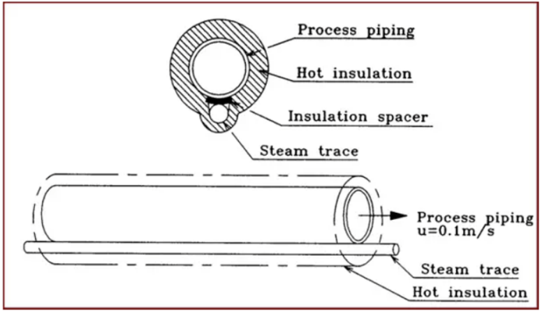 Pour point나 solidifying point가 최저 대기온도보다 높은 액체의 경우 아래 요구조건을 검토해야 한다. 즉, 항상 흐르는 bare pipe에 대해 흐름이 멈춘 후 12시간 이내에 응집할 경우 hot insulation을 고려하며, hot insulation을 적용하는 배관에 대해 흐름이 멈춘 후 12시간 이내에 응집할 경우 비록 액체 온도가 높더라도 tracing을 고려한다.