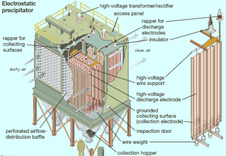 Flue gas가 ESP내로 들어가면 가스내 먼지 입자는 두 전극 사이에서 가스내의 자유 전자와 충돌을 하고, 이 자유전자가 결국 먼지 입자에 부착되어 음전하를 띠게 된다. 그래서 음전하의 먼지 입자는 집진판이라고 불리는 양전극판의 정전기력로 인해 이동하여 deposit 된다.
