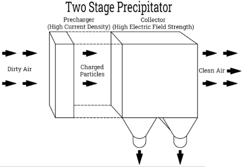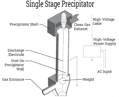 Flue gas가 ESP내로 들어가 고압 직류 전원을 이용해 Transformer-Rectifier (TR)은 incoming power를 고압 DC로 conversion후, 음극 wire mesh나 rod에서 코로나 방전 (typically 20,000~60,000 volts)을 발생시켜 배기 가스 중의 먼지 분진을 하전(전기 입힘)시킨 후, 쿨롱의 힘에 의해 양극의 집진판에 부착하여 제거한다. 즉, 한 쪽은 음극, 다른 한쪽은 양극이 되어 이로 인한 강력한 voltage gradient가 만들어져 그 사이에서 flue gas 중 먼지 입자를 이온화하여 positive plate로 이동하게 된다.