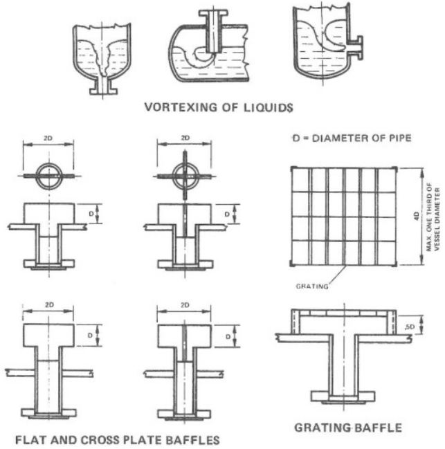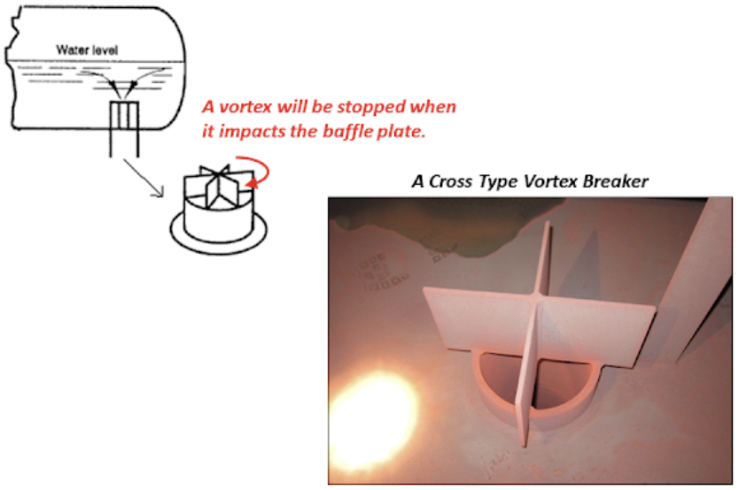 vortex breaker (VB)는 설비나 배관 시스템내에서 유체 흐름상 소용돌이의 형성을 방지하기 위한 device이다. 소용돌이는 설비나 배관 시스템 내 bend나 restriction이 일어나는 nozzle 부위에서 발생하기 쉬우며, 이로 인해 액체 흐름내에 가스가 동반되어 운전 효율 감소 및 설비들의 마모나 침식 등을 야기하며, 가장 중요한 issue는 pump내 기포 유입에 따른 cavitation발생이다.