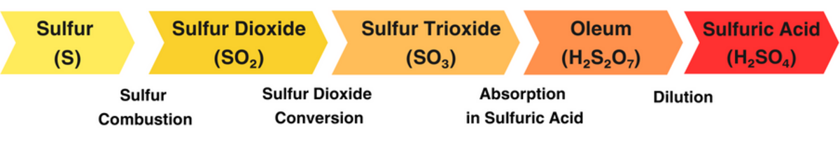 황산이 원료로서 순황(Elemental Sulfur), 황철석(Pyrite), 또는 금속 황화 광석(Metal Sulfide Ore)에서 제조되는 경우, 공정은 황(S)을 연소하여 이산화황(SO2)을 생성하는 것으로 시작된다.