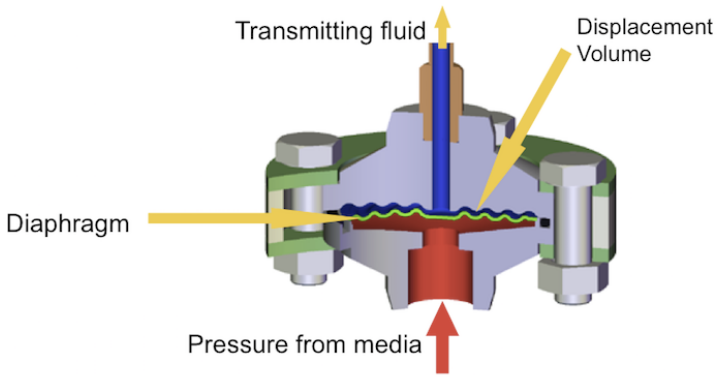 diaphragm은 2개의 flange사이에 clamped된 원형의 flexible membrane이다. membrane 위쪽은 공정유체와 양립할 수 있는 유체로 채워져 적절한 양으로 calibration되어 있다. membrane 아래쪽은 공정유체와 contact되어 그 압력을 받아 위쪽방향으로 혹은 아래쪽 방향으로 휘어지게 한다. 이러한 압력이 계기에 전달되어 dial에 압력 형태로 표기되거나 transmitter를 통해 DCS로 전송이 된다.