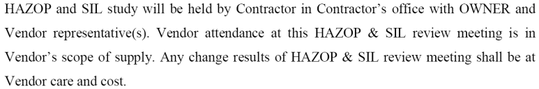 실제 과거 프로젝트를 EPC contatcor자격으로 HAZOP에 참여하였고, 국내 영세 vendor가 package vendor로서 참석을 했는데 설비의 원리나 여러 시나리오에 대해 충분한 설명을 내놓지 못해 원청업체인 EPC contractor에 blame이 제기되기도 하였다.