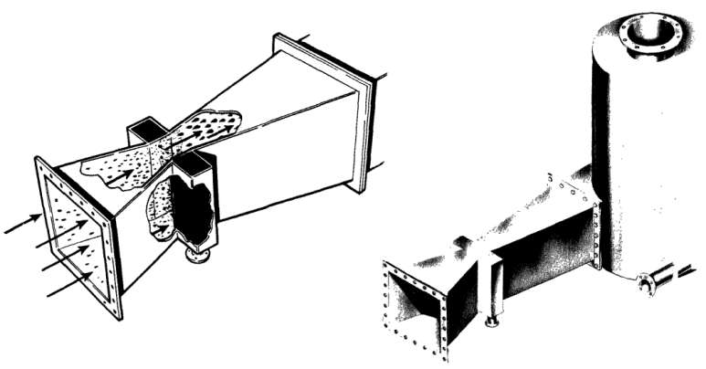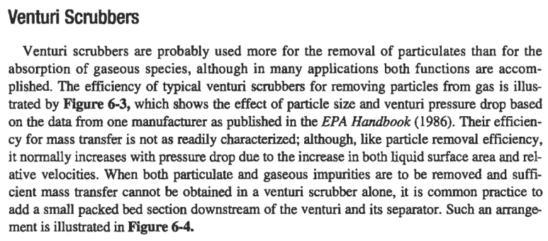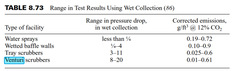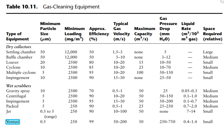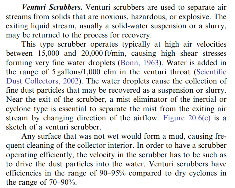 exit부분에는 demister를 설치하여 droplet들이 가스에 딸려가지 않도록 설치되며, dry cyclone의 solid 분리 효율은 70~90%이지만 venturi scrubber는 90~95%로 매우 높다.