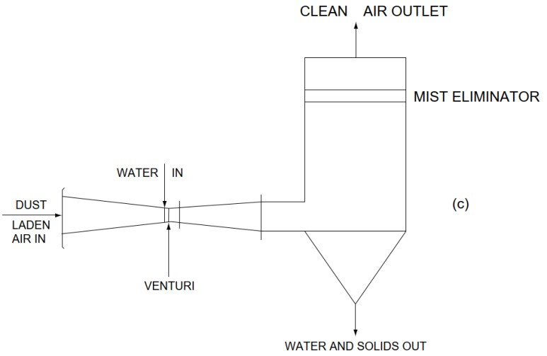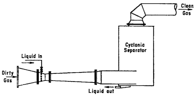 가스나 공기내 solid 형태의 유해물질을 분리하기 위해 사용되며 여기에 세정을 위해 물이 주입되고 이후 물과 solid 혹은 slurry는 recovery를 위해 process로 recycle되거나 폐수처리된다. 고속의 가스흐름에 의해 주입된 물은 미세한 droplet을 형성하고 여기에 fine dust particle을 모아 가스로부터 분리를 한다.