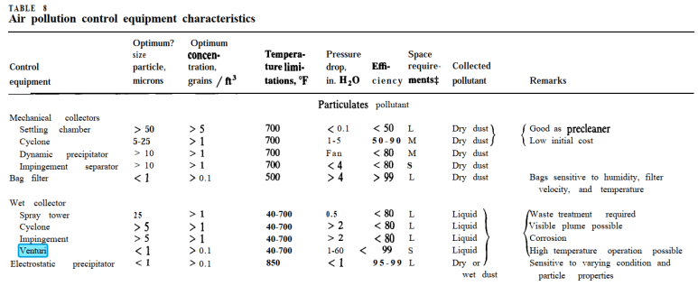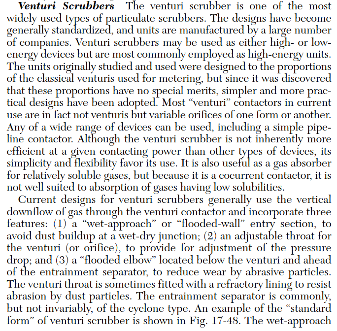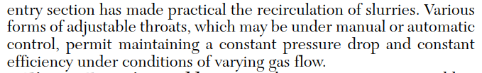 throat에서의 매우 짧은 contact이지만 기-액이 완벽히 섞여 wetted particle과 droplet이 후단 separator에서 분리가 되어 reservoir로 drop된다. 액체의 유량은 1000cfm (28.3CMM)당 3~5gpm (0.68~1.14m3/h)정도 예상된다.