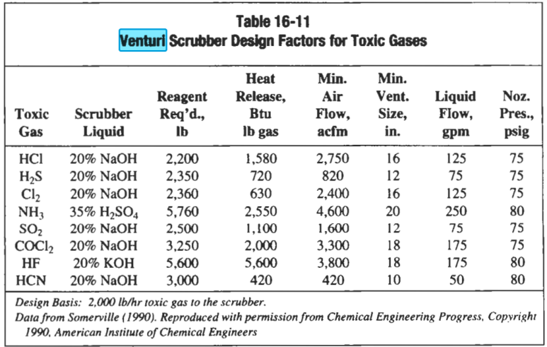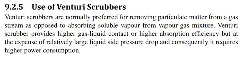이를 위해 플랜트에서 venturi tube로 유입되는 가스에 throat부분에서 액체가 주입이 된다. throat에서의 가스 유속은 15,000~20,000fpm (76.2~101.6m/s)이며 차압은 10~30inH2O (24.9~74.7mbar)이다.
