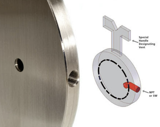 vented blind는 최소 두께 3/4"이며 1/4" NPT radial port가 핸들 기준 90도 혹은 180도 방향에 위치한다. 또한 lockout/tagout을 위해 각 핸들에 hole이 있다.