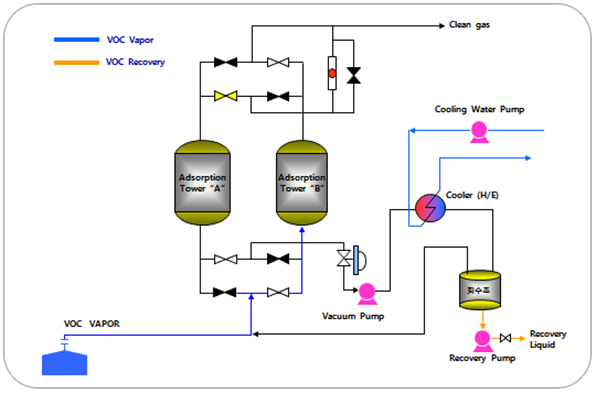 흡착 단계는 도입가스중 상압하에 VOC만 흡착제 기공속으로 흡착이 일어나고 VOC가 아닌 물질은 대기로 vent되며, 탈착 단계는 운전중인 흡착탑이 포화되면 vacuum pump에 의해 탈착이 진행되며 진공 재생이 완료되면 소량의 purge gas가 주입이 된다. 재생과정에서 vacuum pump에 의해 배출되는 VOC 증기는 condenser를 통과하여 액화된 후 recovery tank로 저장이 된다. 아울러 탈착공정시 스팀을 사용하지 않는 건식 공정이므로 스팀 응축에 따른 수분 발생이 없어서 별도의 폐수처리가 필요 없다.