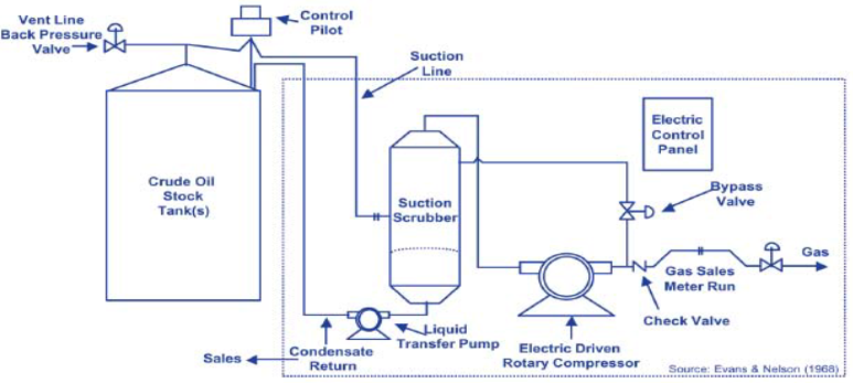 주로 crude tank, condensate tank, glycol dehydrator still column vent gas, casing head gas등을 압축하여 제거 및 회수한다. Typical Capture efficiency는 95%이며, 이는 천연가스를 capture하고 peak interval시 capture하는지 알 수 있도록 sensing 설비를 이용하는 기준으로 100% capture efficiency를 만족하려면 추가적으로 suction에서의 vacuum가능성을 없애기 위해 discharge volume을 suction으로 돌려 보내는 automatic bypass system을 설치해야 하며, gas blanket도 고려하여 system내로 산소가 들어오지 못하게 해야 한다. Motor를 사용한다면 VFD를 적용하고 dry gas외에 wet gas도 handling하는 compressor기준이다.