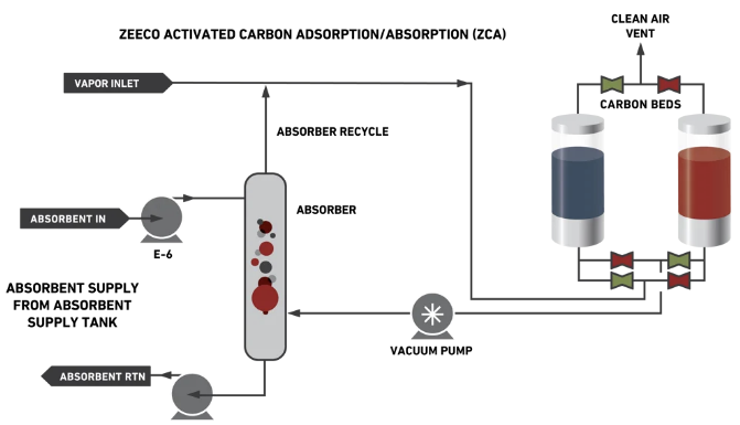반면 Adsorption VRU는 filtration system으로서 주로 truck, railcar, marine vessel, tank의 loading동안 발생되는 vapor를 처리하기 위함이며 vapor는 활성탄 bed를 통해 통과해가면서 가스내 HC을 흡착한 후 clean gas는 대기로 방출한다. 활성탄이 포화되면 재생을 하며 이 때 vacuum pump를 작동하여 이들 HC vapor를 탈착하여 absorber로 보낼 수 있다. absorber tower에서 HC은 가솔린과 같은 absorbent에 의해 흡수되어 다시 tank로 보낼 수 있다. 흡수되지 않은 vapor는 다시 흡착탑으로 recycle되며, 재생주기는 10~15분 정도이다.
