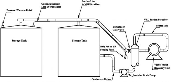 Tank vapor space의 압력에 따라 VRU 운전이 되며, 압력계는 VRU suction으로부터 가능한 멀리 위치한다. compressor후단에서 bypass line을 scrubber suction으로 연결하여 압축이 가능한 일정 압력을 유지하고, bypass mode임에도 압력이 계속 줄어들어 공기가 tank내로 들어오거나 tank가 찌그러지는 것을 방지하기 위해 unit는 shut down하고 다시 start압력이 될 때까지 stand by 상태로 유지한다. 만약 공기가 유입된다면 bypass가 없거나 압력 setting이 부적절하게 설계되었거나, tank hatch sealing이 부적절하거나 breather valve에서 leaking이 원인일 수 있다. 0.5in H2O의 낮은 압력에서 작동하도록 되어 있지만 이렇게 낮은 압력을 측정하는데 있어서 정확도가 매우 낮다. 따라서 gas blanketing을 적용하여 공기 유입에 대한 문제를 경감시킬 수 있다.