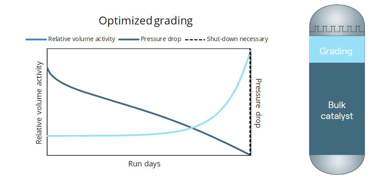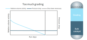 catalyst loading의 최대 cycle length를 유지하기 위해서는 bulk catalyst와 grading사이의 최적의 balance가 매우 중요하다. 너무 적은 grading이 loaded될 경우 cycle은 촉매독과 과도한 차압에 의해 단축되고, 반면 지나치게 grading을 loading할 경우 (동일 reactor sizing 대비 bulk catalyst가 상대적으로 적게 charging될 수 있음) grading이 최대한 utilized하기도 전에 이미 bulk catalyst의 activity가 제한될 수 있다.