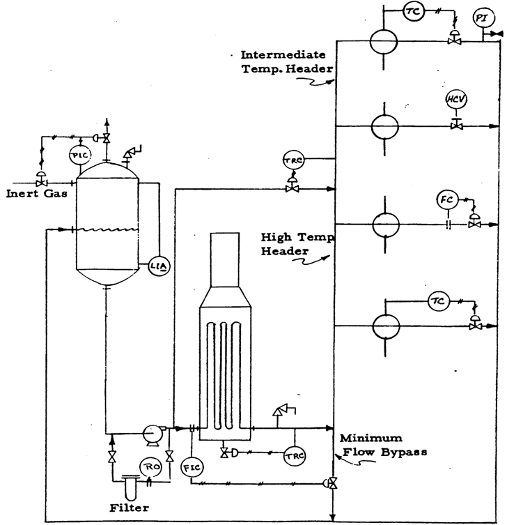 Hot oil온도는 fuel양을 조절하며, 만약 2가지 온도가 필요하다면 series배열을 통해 구현할 수 있고, intermediate temperature user를 위한 차압 유지가 필요하면 bypass line에 차압 controller를 설치할 수 있다.