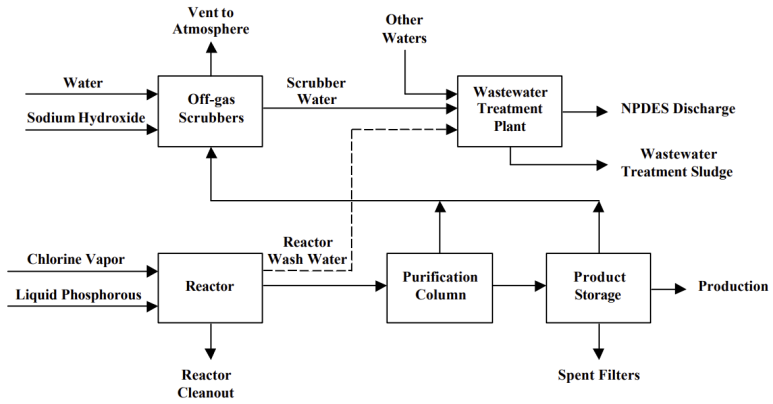 액체상태의 황린이 반응기속으로 분사되며 동시에 염소가스가 주입이 되면서 반응이 시작되고, 발열반응이며 반응열로 인해 PCl3가 증발된다. vapor는 structured packing column을 통해 condenser에서 응축이 되어 정제된 액체의 PCl3를 얻게 된다. 증류탑이나 저장 탱크로부터 잔여 가스는 water scrubber에 의해 제거되어, 폐수형태로 배출되며 중화된 후 WWT로 보내진다. (약산의 염산과 인산 폐수임)