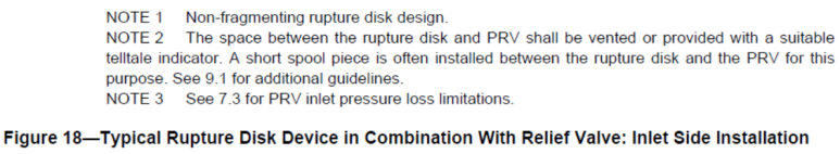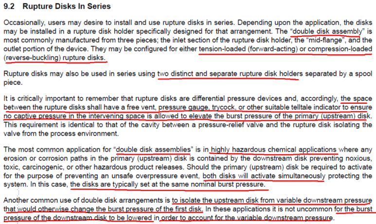 rupture disk가 series로 설치되는 경우는 공정 서비스가 매우 toxic하여 첫번째 disk에서 crack이 일어나도 PSV에 직접 영향을 주지 않도록 동일한 disk를 2개 설치하며 이 때 set pressure도 동일하게 설정하되 disk사이에는 PSV와의 combination과 동일하게 venting을 설치해야 한다.