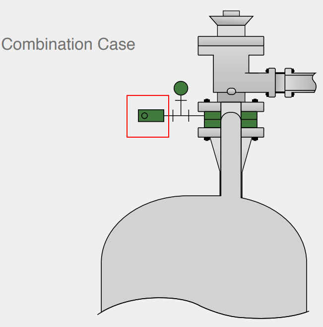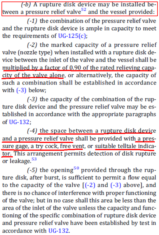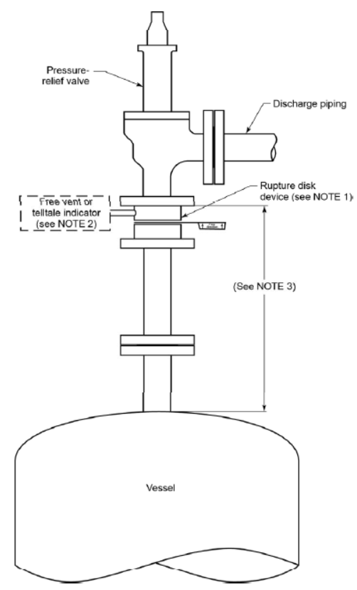 PSV와 rupture사이의 tell tale indicator는 압력을 모니터링하여 rupture disk가 leak되었는지 알 수 있다. 이 압력은 매우 중요하여 이 압력이 증가하면 rupture disk는 원하는 압력에서 파열되지 못해 system을 보호하지 못할 수 있다. typical하게 PG, trycock, free vent로 구성되며 아래와 같다.