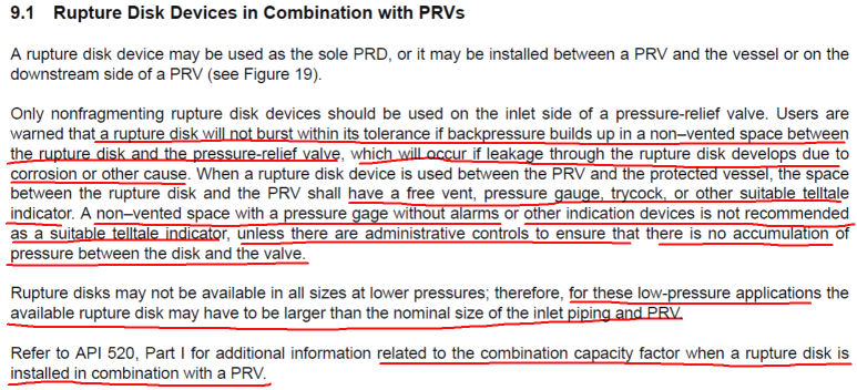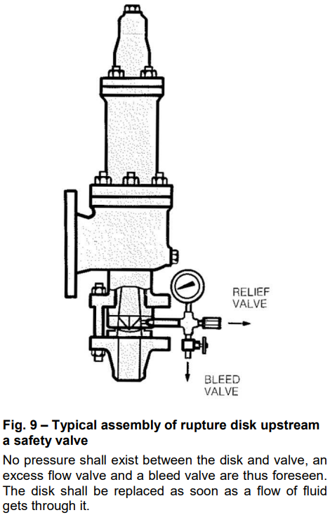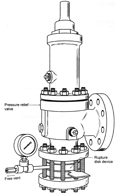 rupture disk가 PSV전단에 위치하여 PSV의 부식을 방지하며 plugging도 방지한다. sealing역할도 하여 PSV를 통한 leak를 방지한다. 가끔씩 저압 rupture disk가 PSV후단에 설치되어 common manifold가 부식 분위기일 경우 고려한다.