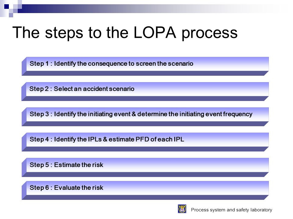 LOPA란 Layer of Protection Analysis의 약어로서 IPL (Independent Protection Layer) 기준을 만족하는 safeguard를 identify할 수 있는 semi-quantitative methodology라고 할 수 있다. (위험성을 분석하고 평가하기 위한 간단한 정량적 도구)