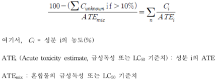 반면, 이용 가능하지 않은 성분 조성의 합이 10%를 초과하는 경우에는 아래 식을 이용하며 급성 독성을 모르는 성분의 함량은 별도 표시한다.