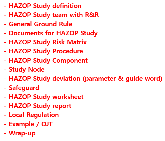 HAZOP Study는 지금까지 사업장을 방문하여 컨설팅/용역 형태로 진행되어 왔지만 최근 HAZOP Study를 사업장 자체적으로 수행하기 위한 역량 강화의 일환으로 특강을 요청하는 업체가 문의를 하여 이번 기회에 그동안 용역을 수행했던 경험 및 knowhow로 강의 교재를 만들었다.