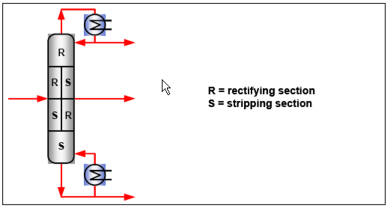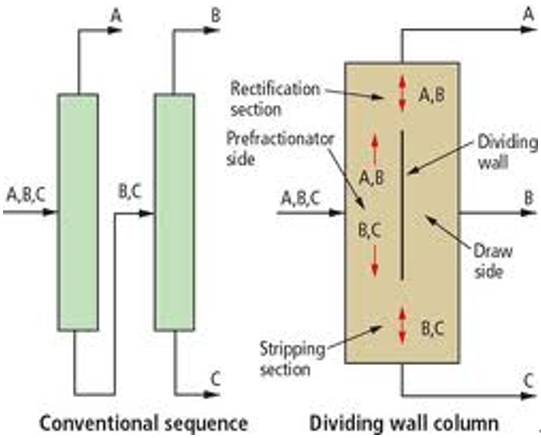 투자비와 운전비 (에너지비용)를 20~50% 절감할 수 있고, 공간을 효율적으로 활용할 수 있다. ternary mixture (예를 들어 BTX 분리)의 분리에 가장 효과적이다.