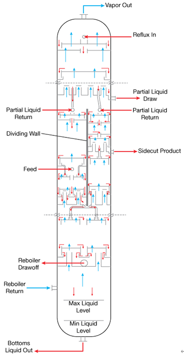 Divided wall column은 3개 이상의 product에 대해 높은 효율로 분리하기 위해 증류탑에 dividing wall을 설치하여, 특정 구간을 두 부분으로 나누어 top, bottoms외에 sidecut을 분리할 수 있다.