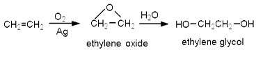 EO는 주로 EG생산에 사용되지만 그 외에 ethanolamine, glycol ether, polyethylene glycol, surfactant 제조에도 사용된다. EO는 먼저 Ag 촉매하에서 에틸렌의 직접 산화에 의해 만들어지며 이 때 에틸렌이 CO2로 산화되는 것을 방지하기 위해 chlorinated moderator가 소량 주입되어 EO로의 selectivity를 높인다. 아울러 Ag촉매에 여러 다른 metal을 소량 주입하여 selectivity를 극대화한다.