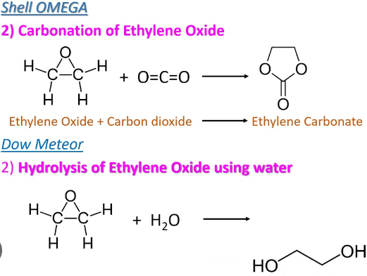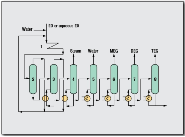 MEG는 EC (ethylene carbonate)의 가수분해를 통해 만들어지며, EC는 EO와 CO2와의 반응에 의해 생성되고, EO는 에틸렌의 산화에 의해 만들어진다.