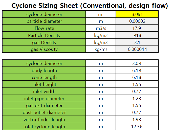 Inlet velocity 15m/s를 기준으로 cyclone diameter를 계산하고 이후 cyclone dimension을 확정한다.