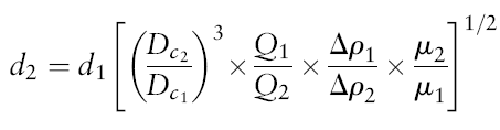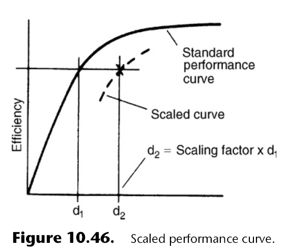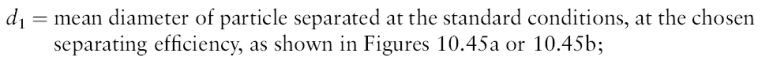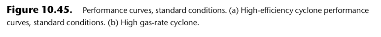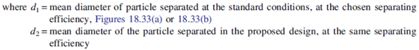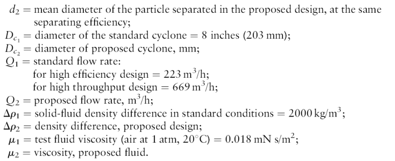 아래는 표준 테스트 조건에서 실험적으로 작성된 성능 곡선이며, 주어진 효율에 대해 다음의 scaling factor를 이용하여 다른 cyclone 크기와 운전 조건으로 전환할 수 있다.