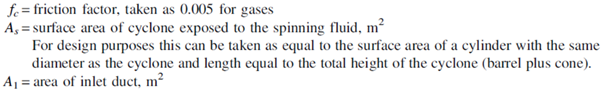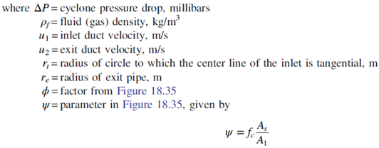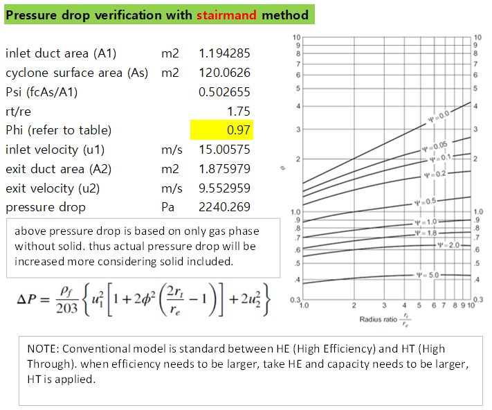 pressure drop은 Cyclone내 entry loss, exit loss 그리고 friction loss, kinetic energy loss에 기인한다. stairmand에 의한 실험식을 이용하여 계산한다.