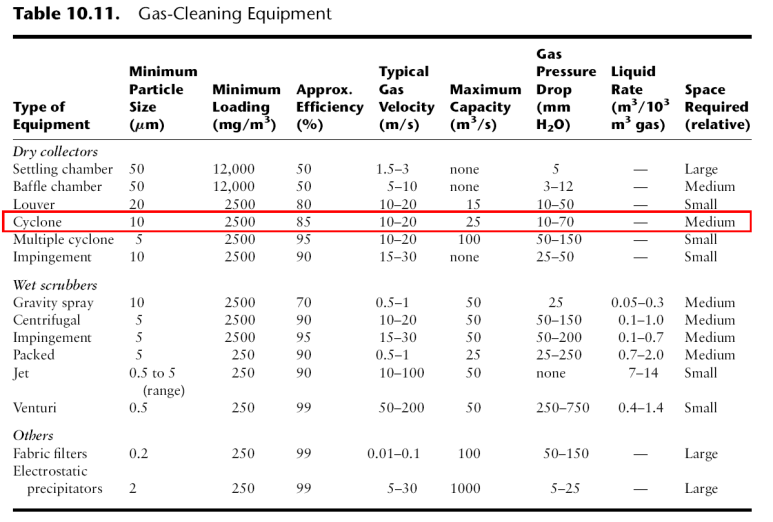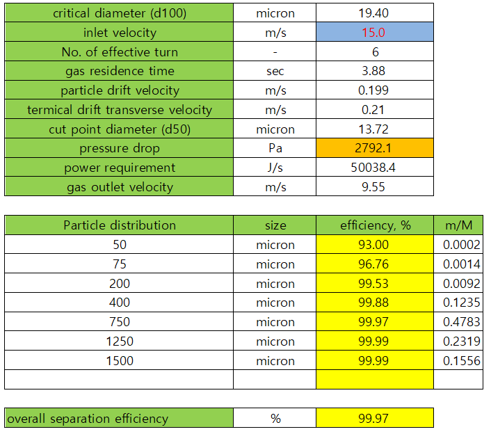Cyclone은 inlet velocity가 9~27m/s가 되도록 설계하고, 최적의 값은 15m/s이다.
