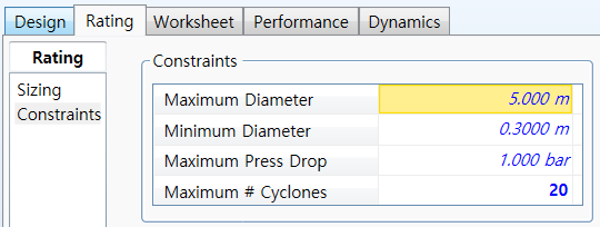Design mode가 on이라면 constraint내에서 body diameter는 자동 계산이 되며, parallel cyclone개수도 보여주고, off라면 body diameter와 parallel cyclone 개수를 specify할 수 잇다. Design mode가 on일 경우 아래 constraint가 valid하다.