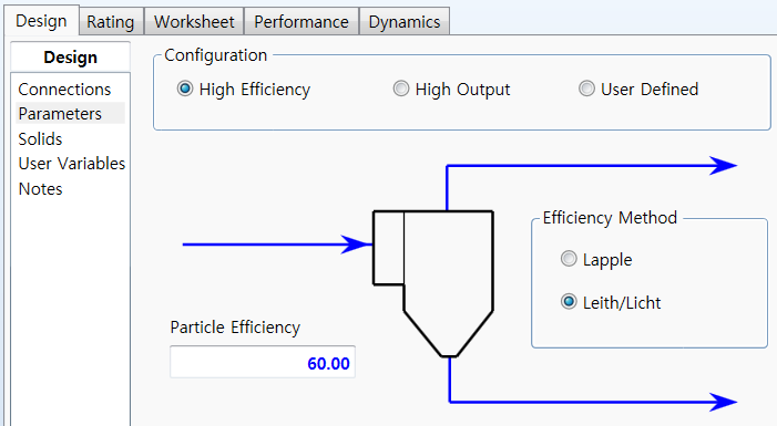 cyclone이 solid를 분리하는 설비임에 따라 solid definition이 size에 결정적 역할을 하므로 input 정보가 정확해야 한다.