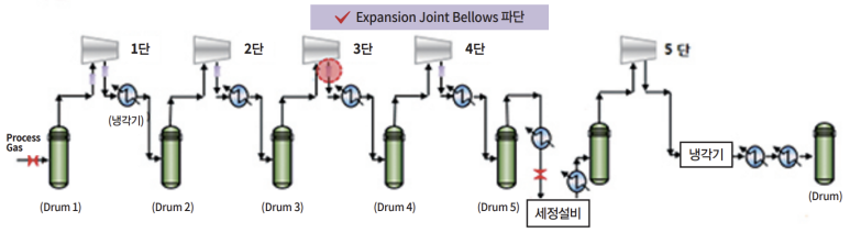 2020년 3월 ○○○사업장의 NCC공장 압축공정의 분해가스 압축기의 3단 토출부 신축이음 (Expansion Joint, 20")이 파단되어 에틸렌, 프로필렌 등을 포함한 다량의 납사(Naphtha) 분해가스가 누출되어 대규모의 폭발 · 화재가 발생한 사고이다.압축 공정 개요사고 발생 후 신축이음 타이로드형 신축이음(Tie-Rod Expansion Joint)신축이음은 증기나 가열된 가스와 같은 고온 물질을 전달하거나 배관의 움직임과 진동을 흡수하기 위해 배관에 설치하는 배관자재의 한 종류이며, 사고가 발생한 신축이음은 신축이음 양쪽 끝에 벨로우즈가 하나씩 총 2개소가 설치되어 있다. 신축이음의 주요 구성품인 벨로우즈는 몇 개의 주름으로 이루어져 있고 각 주름 사이에는 벨로우즈의 강도 향..